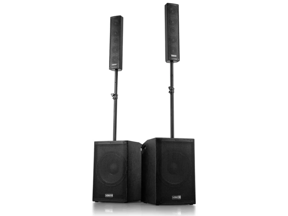 VX1080BT je kompletní reproduktorová sada typu plug & play. Vše, co potřebujete k zprovoznění, je součástí balení. Veškerý výkon pochází z jednoho 15″ subwooferu, ve kterém je umístěn zesilovač. Horní reproduktory a pasivní subwoofer jsou připojeny k jednotce zesilovače. Vestavěný přijímač Bluetooth vám umožňuje snadno streamovat hudbu bezdrátově ze smartphonu, nebo můžete použít vestavěný MP3 přehrávač s USB a SD sloty.
