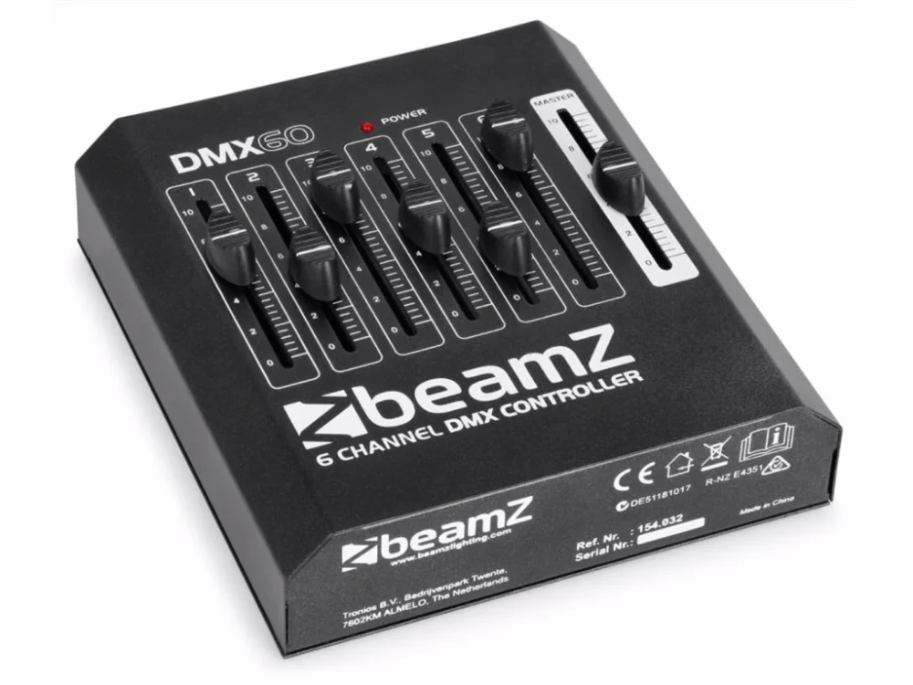 Osvětlovací konzole se šesti jednotlivými kanály s fadery ovládajícími zařízení přes DMX. Vhodné pro dekorativní osvětlení, zónové osvětlení a použití hlavního faderu ke ztlumení světla, aby se příležitostně vytvořila útulná atmosféra. Lehké pro snadné použití kdekoli.