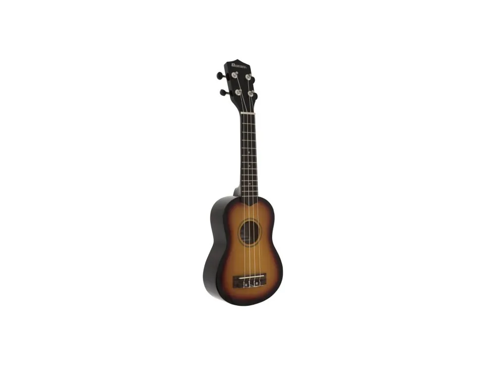 Sopránové ukulele. Vrchní deska, spodní deska, luby a krk nato, hmatník vícevrstvá dýha (12 pražců), kobylka blackwood, mechanika s černými plastovými knoflíky.Menzura 350 mm, celková délka 535 mm. Barva stínovaná (sunburst).