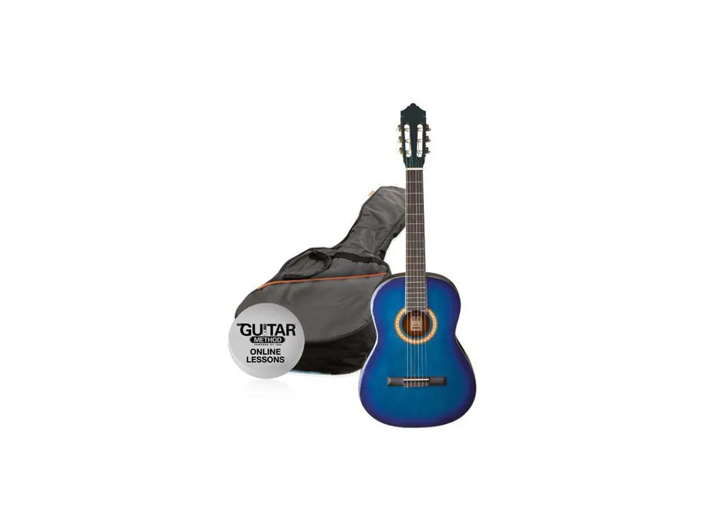 Paket klasické 1/2 kytary Ashton SPCG 12 v barevném provedení – modrá. Vynikající poměr kvalita/cena. Součástí dodávky je obal na kytaru a online škola hry (angličtina). Vrchní deska linden (lípa), krk javor, struny nylonové. Vhodná např. pro začátečníky  – od 6 do 8 let (cca 115 – 135cm).