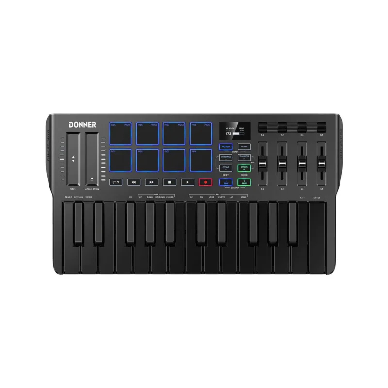 DMK-25 PRO je MIDI klávesnice od výrobce Donner. Podpora standardu Plug & Play zajišťuje kompatibilitu s jakýmkoliv počítačem (PC / Mac) nebo mobilním zařízením (iOS / Android) vybaveným USB rozhraním, a to bez potřeby instalace dalších ovladačů. Jednoduché ovládání umožňují intuitivně rozmístěná tlačítka a pady a OLED displej. Výkonné funkce arpeggia, přehrávání a akordů usnadňují hudební produkci a komponování. Štíhlý design a kompaktní rozměry nástroje dovolují snadné použití kontroleru na cestách.