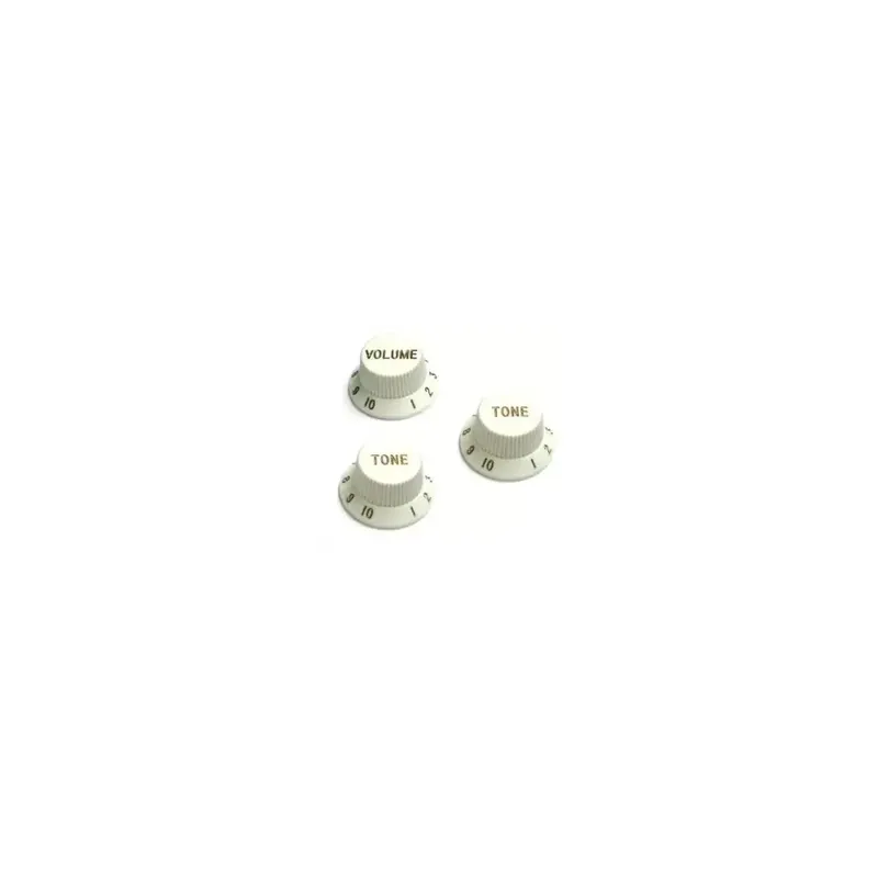 Sada knobů na Fender Stratocaster. Jeden ovladač hlasitosti (VOLUME) a dva tónové clony (TONE). Bílé se zlatým písmem. Push-on knoby pro tradiční split shaft USA CTS potenciometry. Vhodný pro starší USA a nové USA Vintage Serie Stratocasterů. Číslo dílu Fender 0992035000.