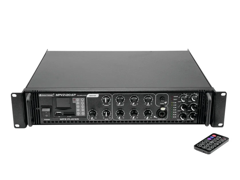 Pohodlné ovládání PA reproduktorů pomocí 6 zónového zesilovače se zabudovaným MP3 přehrávačem o celkovém výkonu 120W RMS. 6 oddělených výstupních zón se samostatnou regulací úrovně signálu. Master PA výstup (70V a 100V), klasické připojení reproboxů s nízkou impedancí (4-16 ohmů). MP3 přehrávač (USB/SD) s infračerveným dálkovým ovládáním a LCD s modrým podsvícením. 2 vstupy pro mikrofon (Jack 6,3 mm, nesymetrické). 1 přední vstup pro mikrofon (XLR / Jack 6,3 mm, nesymetrický). Oddělené ovládání vstupního signálu jednotlivých kanálů, 2 pásmové korekce. 3 linkové vstupy (stereo RCA), 1 audio výstup (stereo RCA). Led indikace výstupního signálu na předním panelu zesilovače. Aktivní chlazení ventilátorem, zabudované ochranné obvody s LED indikací proti přetížení, přehřátí a zkratu.