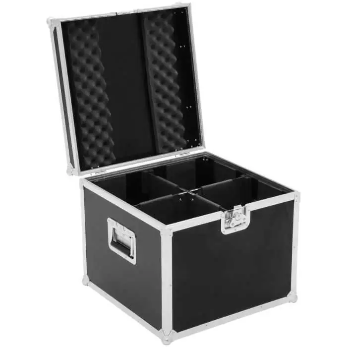 Profesionální přepravní case pro 4 dlouhé LED reflektory PAR 56. Vnitřní prostor je rozdělen na 4 samostatné sekce pro reflektory. Rozdělovací kříž je možné vyjmout, takže case je možné využívat univerzálně i pro jinou techniku a příslušenství. Kvalitní zpracování, vyrobeno ze 7 mm laminovaného březového multiplexu v tmavě hnědém provedení. Polstrování plastazotte, kování Adam Hall, hliníkový rám 22 x 1,5 mm, malé kulové 3 stranné rohy, 2 vyklápěcí držadla, panty s dorazem, 1 butterfly zámek.: Maximální zatížení: 50 kg