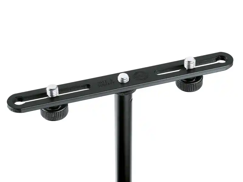 Mikrofonní adaptér pro upevnění 2 mikrofonů nebo mikrofonních ramen. Šrouby se závitem 3/8″. Délka adaptéru 200 mm. Nastavitelná rozteč otvorů 60/172 mm. Černá barva.