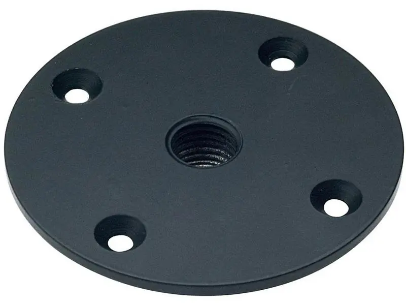 Závitová deska do reproboxů pro distanční tyče se závitem M20, průměr 105mm, 4x montážní otvor 6,5mm pro šrouby, vyrobeno ze zinkové slitiny, barva černá. Dopručené tyče Konig Meyer 21334, 21339, 21340.