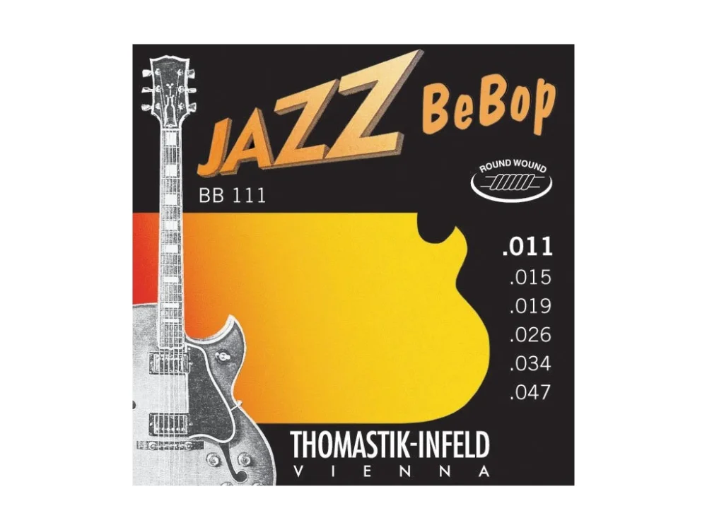 Sada kytarových strun s kulatým niklovým opředením pro jazzové kytary s velkou ozvučnicí.