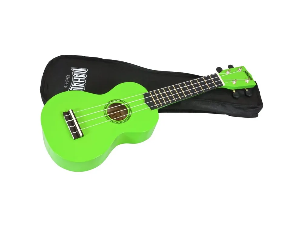Sopránové ukulele ze série Rainbow, které je dostupné v několika zářivých barevných provedeních. Tento model v barvě listová zeleň.