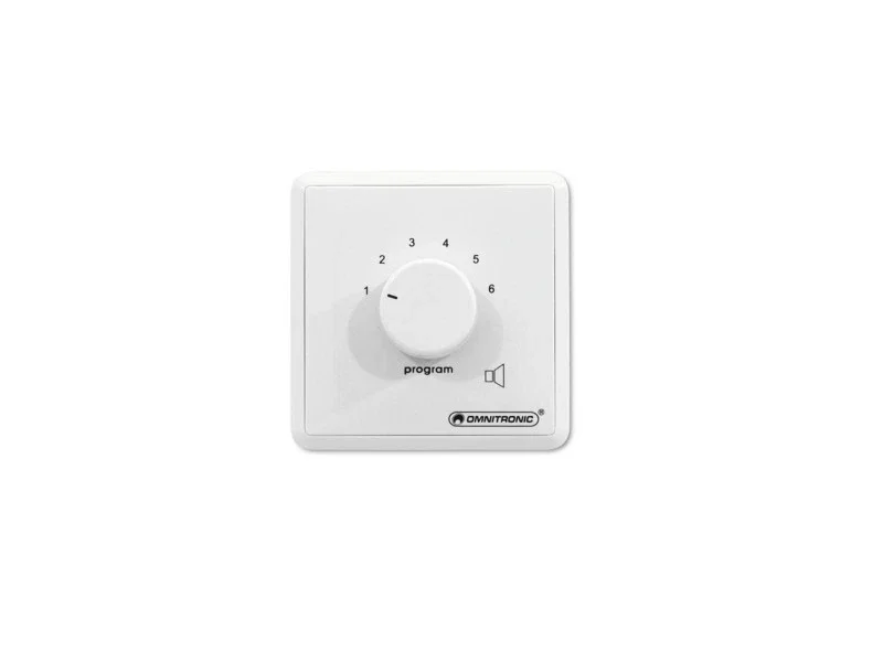 Nástěnný PA volič programů s 24V nouzovým prioritním relé, přepíná jeden ze 6 zdrojů signálu na výstup jednoho reproduktoru, vhodné pro 100V audio techniku nebo jiné signály, bílý plastový přední panel a knoflík, zapuštěná montáž do běžných nástěnných zásuvek 60 mm, povrchová montáž s volitelným pouzdrem PA SF, montážní hloubka 35 mm, šroubové připojení.