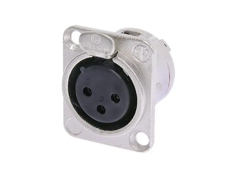 NEUTRIK panelová samice XLR, standardní rozměr D, 3-pin, stříbrné kontakty, kovový obal, stříbrná barva.