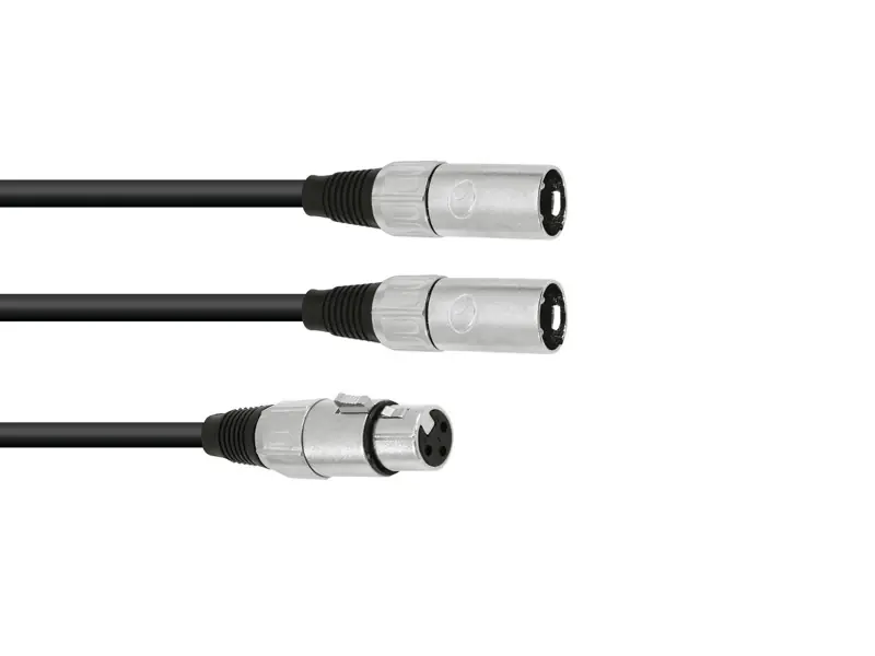 Propojovací kabel 1x 3-pinová XLR zásuvka – 2x 3-pinová XLR zástrčka. Délka kabelu 1 metr, černé barevné provedení.