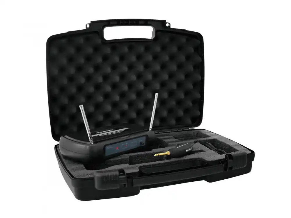 Profesionální diverzitní UHF bezdrátový systém pro kytaristy nahrazující kabel mezi kytarou a pódiovým zesilovačem nebo mix pultem a dovoluje jedinečnou svobodu pohybu na pódiu. Přijímač se dvěma skládacími anténami pracuje v nízkofrekvenčním pásmu (863.500 – 864.500 MHz), má vyvážený XLR výstup a nevyvážený výstup 6,3 mm jack, možnost nastavení úrovně výstupního signálu, LED indikátor antény A/B, audio signálu a vrcholu. Součástí balení kabel Jack-Jack k propojení přijímače s mixem. Lehký mikrovysílač s aerodynamickým tvarem s 6,3 mm Jackem, přepínatelné vstupní tlumení 0 dB, -0 dB, LED indikátor kapacity baterie. Používejte s dodávanými AAA bateriemi. Schválený v EU bez nutnosti vlastnit licenci. Sestava je vč. baterií a napájecího zdroje přijímače dodávána v plastovém přepravním kufříku.