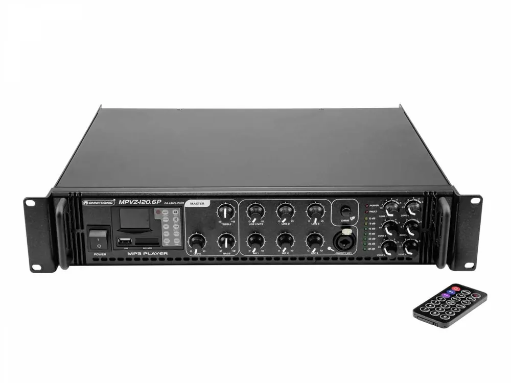 Pohodlné ovládání PA reproduktorů pomocí 6 zónového zesilovače se zabudovaným MP3 přehrávačem o celkovém výkonu 120W RMS. 6 oddělených výstupních zón se samostatnou regulací úrovně signálu. Master PA výstup (70V a 100V), klasické připojení reproboxů s nízkou impedancí (4-16 ohmů). MP3 přehrávač (USB/SD) s infračerveným dálkovým ovládáním a LCD s modrým podsvícením. 2 vstupy pro mikrofon (Jack 6,3 mm, nesymetrické). 1 přední vstup pro mikrofon (XLR / Jack 6,3 mm, nesymetrický). Oddělené ovládání vstupního signálu jednotlivých kanálů, 2 pásmové korekce. 3 linkové vstupy (stereo RCA), 1 audio výstup (stereo RCA). Led indikace výstupního signálu na předním panelu zesilovače. Aktivní chlazení ventilátorem, zabudované ochranné obvody s LED indikací proti přetížení, přehřátí a zkratu.: Napájení: 230 V AC, 50 Hz
