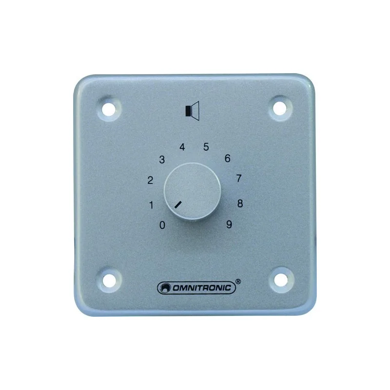 Omnitronic PA ovladač hlasitosti 10 W, stereo, stříbrný. 4-Ohmový stereo zesilovačový vstup a 4-Ohmový stereo reproduktorový výstup. Zesílení v 10 krocích. Hliníkový přední panel a knoflík. Připojení přes šroubovací svorku. K dostání v různých barvách a s různými hodnatami výkonu.
