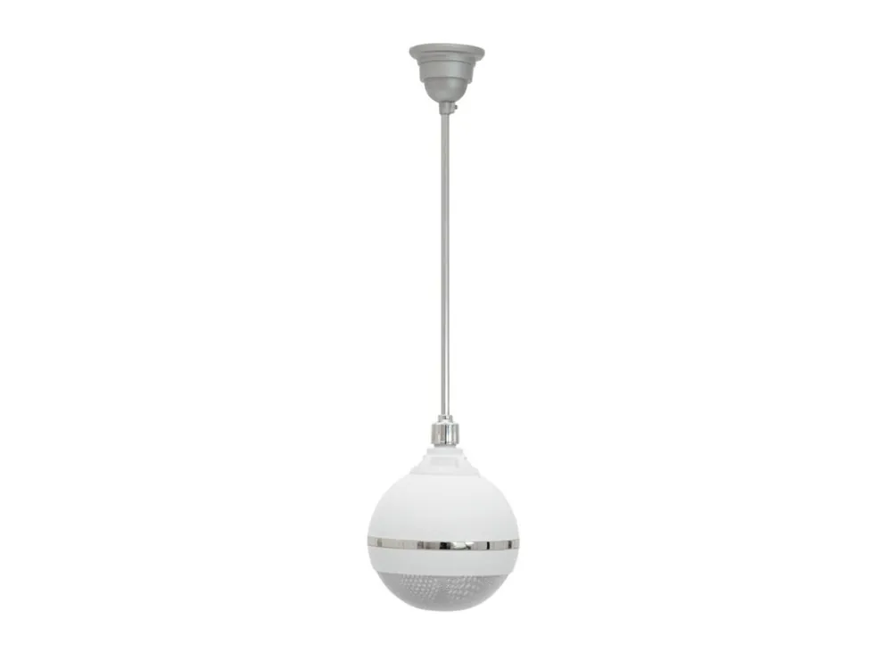 Stropní závěsný 2-pásmový reproduktor. Atraktivní kulový design, bílé barevné provedení. Reprobox je osazen 5,5″ (14 cm) basovým reproduktorem, 0,5″ (1,5 cm) výškovým reproduktorem a 100V transformátorem, výkon 10W RMS. Robustní plastová konstrukce, černá ochranná mřížka reproduktorů, závěsná 42 cm hliníková trubka s integrovaným propojovacím kabelem. Ideální pro ozvučení velké plochy interiéru s vysokými stropy.