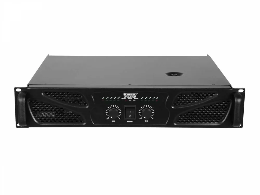 3 operating modes can be selected (stereo, parallel or bridged). Input sensitivity adjustable. Speaker switch-on delay. 2 level controls. Each channel with LED for activated protective circuit (protect) and output meter with clip LED. Complete protection set against short-circuit, overheat, DC voltage, power on/off transients. Fan cooling. Signal inputs via XLR or RCA connectors. Speaker outputs via lockable speaker jacks and pairs of screw terminals. Additional Speaker plug for 8-ohm bridge operation. Class H circuitry. Rack installation with 2 units.: Power supply: 230 V AC, 50 Hz