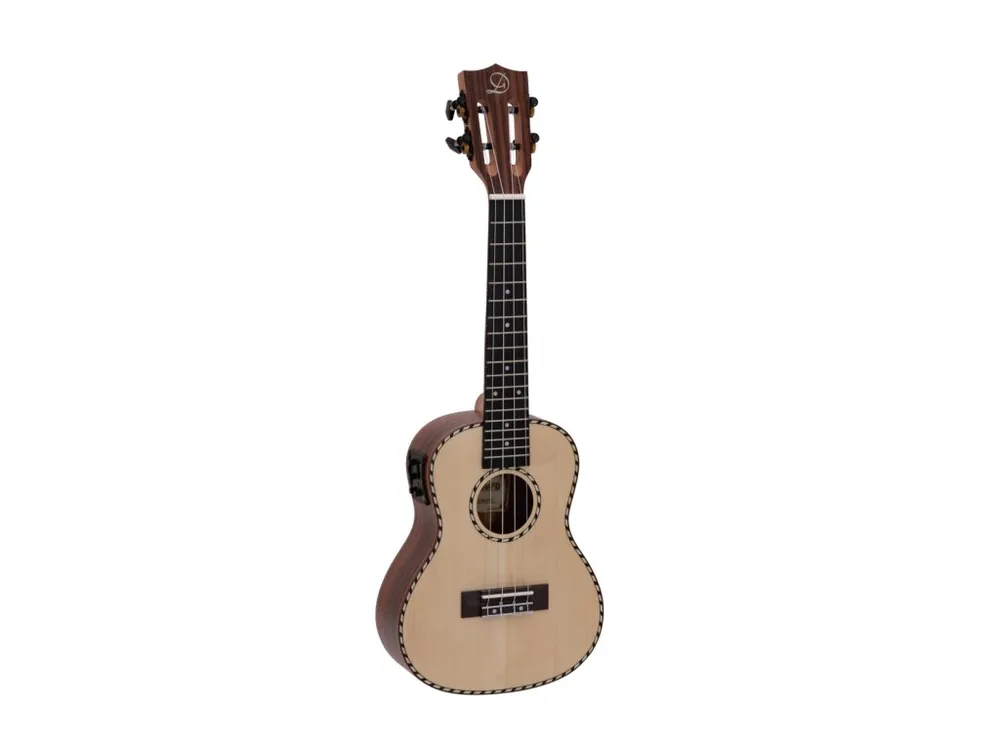 Elektroakustické koncertní ukulele. Vrchní deska masivní smrk, spodní deska a luby palisandr, krk gaboon (okoumé), hmatník ořech (18 pražců), kobylka ořech, černobílé lemování těla, menzura 375 mm, nultý pražec 35 mm, chromovaná mechanika, kobylkový piezo snímač, aktivní elektronika s třípásmovým ekvalizérem, regulací hlasitosti a vestavěnou ladičkou (součástí dodávky 2x knoflíková baterie 3,0 V CR2032), výstup jack 6,35 mm. Barva přírodní matná.