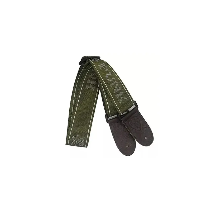 Kytarový textilní řemen Pecka Punk Skull AGSP-500 v zeleném provedení. Šířka řemenu je 5cm, délka je od 73cm do 145cm. Řemen je vyroben z měkké bavlněné tkaniny, konce jsou z pravé kůže.