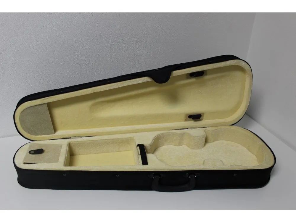 Odlehčený kufr pro 3/4 housle, pevná skořepina z lehké pěny, potažená odolnou látkou, samostatná přihrádka pro příslušenství, dva úchyty pro smyčce, ucho na přenášení.