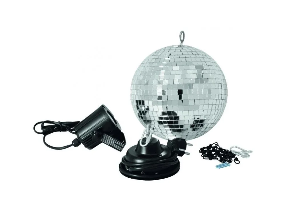 Kompletní sestava 20 cm zrcadlové koule, motorku s rychlostí otáček 1,5/min., závěsného 33 cm řetězu a výkonného reflektoru s 3 W LED světelným zdrojem (6000K). Snadná montáž i zapojení, nízká spotřeba energie, dodáváno v kolorované krabici. Ideální pro menší diskotéky a taneční kluby, mobilní párty i domácí použití.