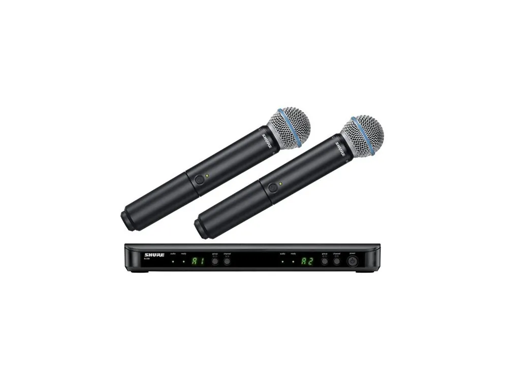 Shure – BLX288E/B58 K3E • duální bezdrátová sada • 2x bezdrátový ruční vysílač s mikrofonní vložkou Beta 58 + 2x vysílač BLX2 + přijímač BLX88E • pracovní frekvence: 606-630 MHz