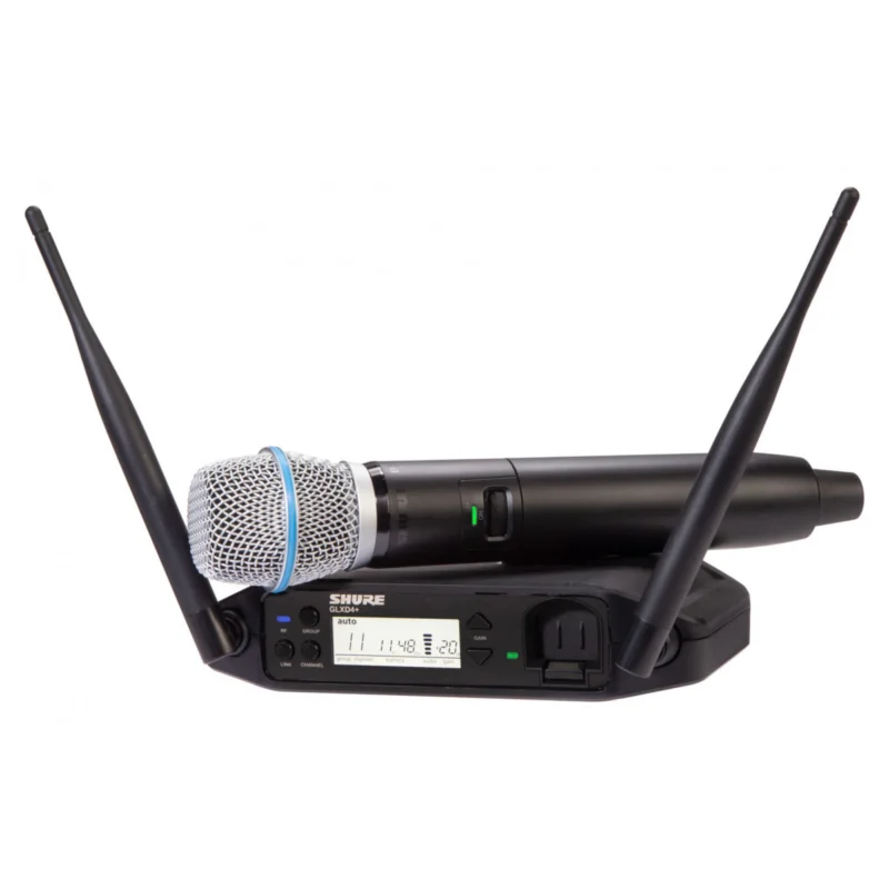 SHURE GLXD24+/B87A je bezdrátový set určený pro snímání živého zpěvu. Skládá se z ručního vysílače GLXD2+ osazeného mikrofonní kapslí BETA 87A a přijímače GLXD4+. Sestava pracuje v bezlicenčním pásmu 2,4 a 5,8 GHz, poskytuje zvuk v 24bitovém rozlišení s dynamickým rozsahem až 120 dB . Superkardioidní směrová charakteristika mikrofonu BETA 87A umožňuje přesné zaměření zdroje zvuku, eliminuje nežádoucí přeslechy a minimalizuje zabarvení signálu při snímání mimo osu.