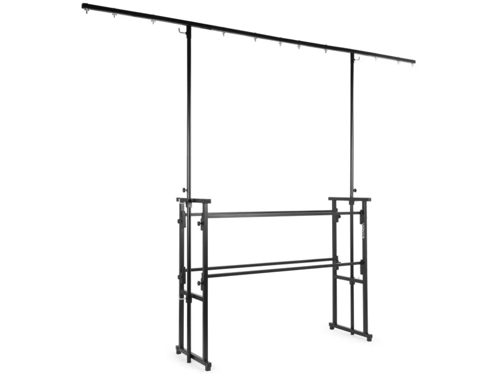 Multifunkční stojan určený pro instalaci DJ aparatury a světelných efektů. Konstrukce je navržena pro rychlou montáž a demontáž. Stojan se skládá ze základny se dvěma úrovněmi a odnímatelné T-hrazdy. Horní úroveň o rozměrech 130 x 47 cm a pracovní výšce 100 cm je určena pro umístění primárního DJ vybavení, jako jsou mixážní pulty a přehrávače. Spodní úroveň poskytuje prostor pro další komponenty, například zesilovače, ekvalizéry nebo přepravní obaly. Součástí je výškově nastavitelná T-hrazda pro zavěšení světelných efektů. Její výšku lze regulovat v rozsahu 210 až 240 cm.