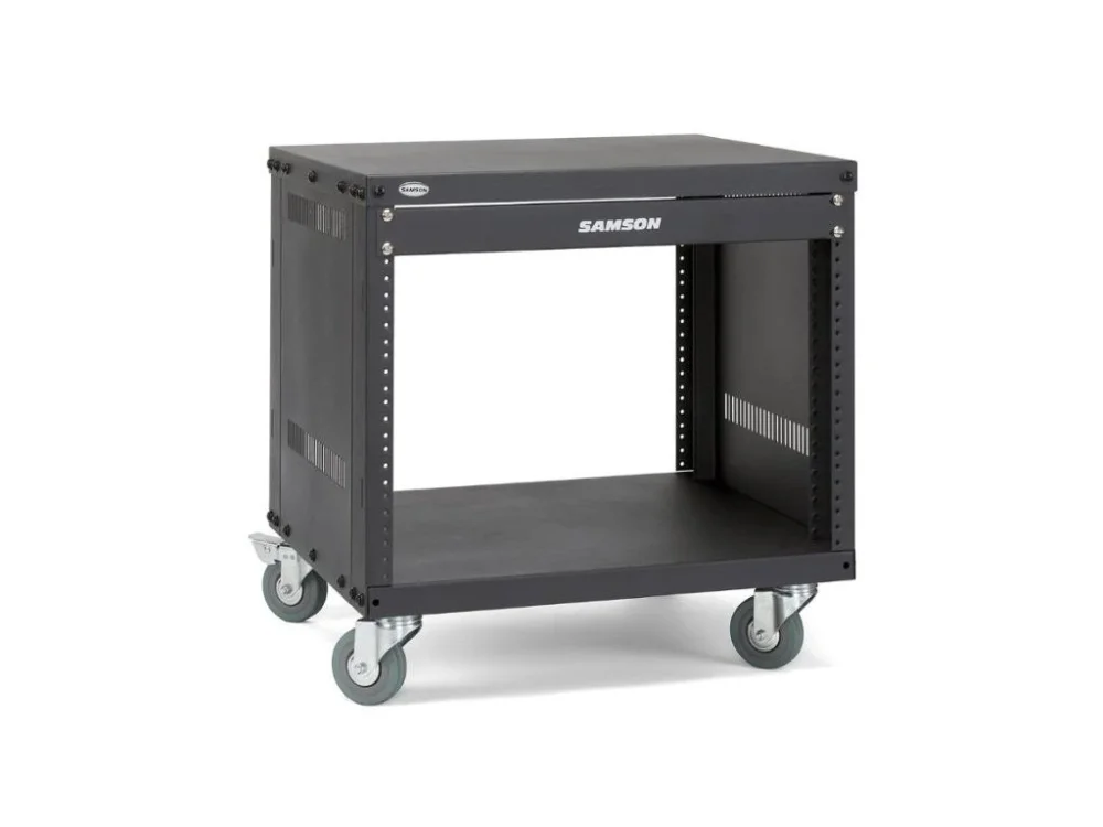 19 rack. 8 U jednotek. Pevná ocelová konstrukce kolečka (75mm) s aretací.