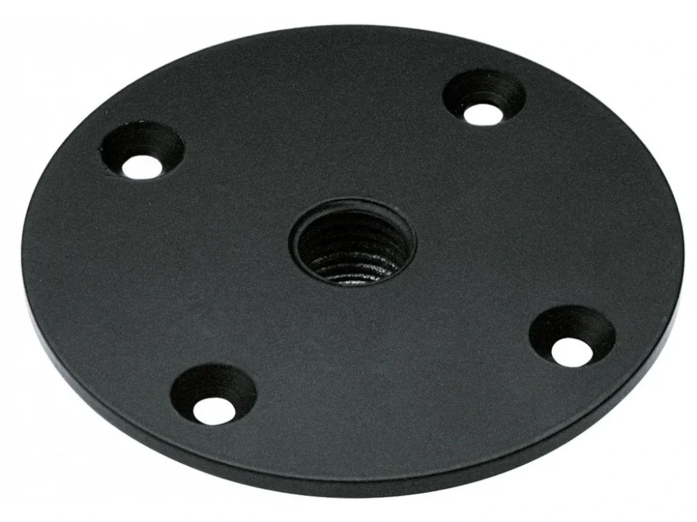 Upevňovací člen pro reproboxy. Průměr 105 mm, čtyři montážní otvory o průměru 6,5 mm. Vhodný pro použití s distančními tyčemi se závitem M20. Vyrábí se v černé barvě.