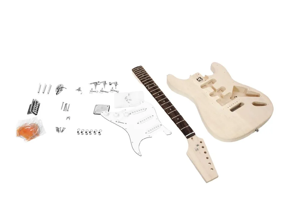 Kytarová stavebnice typu Strat s kompletní sadou montážních prvků a předmontovanou elektronikou. Tělo lípa, šroubovaný krk javor, menzura 648 mm, hmatník blackwood, 22 pražců, kobylka klasické tremolo typu Strat, chromovaná mechanika, 3x jednocívkový snímač (single coil), 1x ovládání hlasitosti, 2x ovládání tónu, 5-ti polohový přepínač. Součástí dodávky sada strun 009-042. Bez povrchové úpravy – připraveno k lakování.