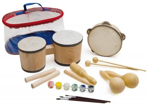 rytmický set – namaluj si sám, obsahuje: 1x bongo, 1x tamburína s chrastítky, 1x ozvučná dřívka, 1x guiro, 1x pár maracas, 3x štětce, 1x pár paliček, 6x barev, 1x plastová taška, vyrobeno v Německu