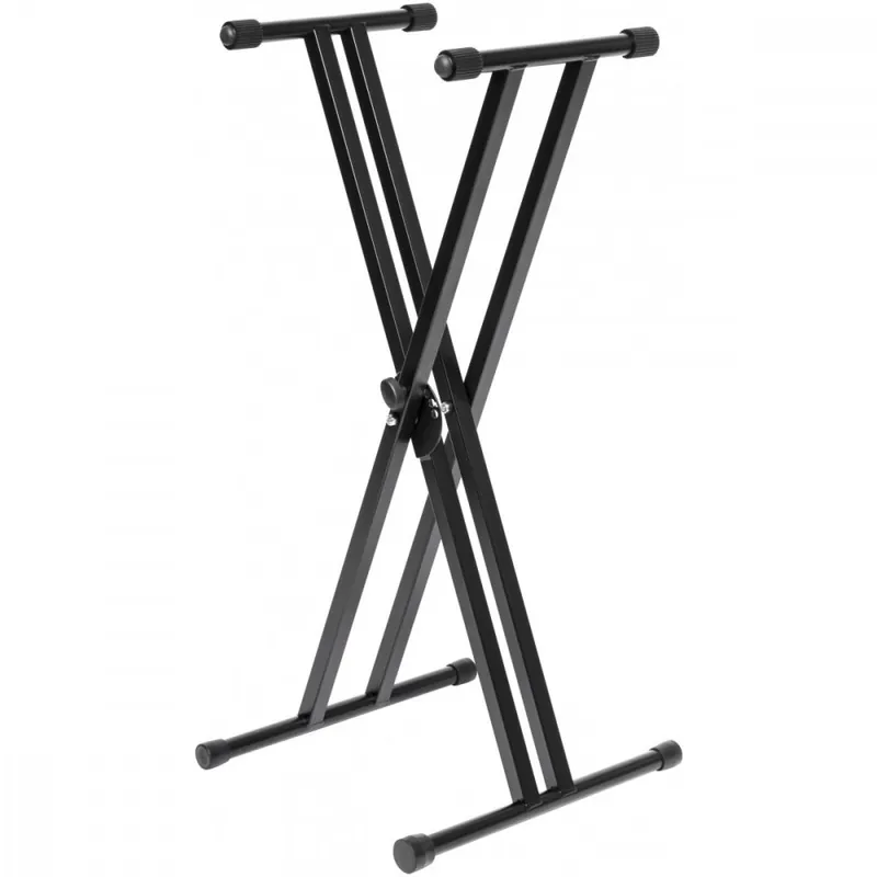 Dvojitý klávesový stojan, nastavitelná výška 69 – 99 cm v pěti polohách, maximální nosnost 30 kg, průměr trubky 25 mm, hmotnost 4,2 kg. Barva černá.